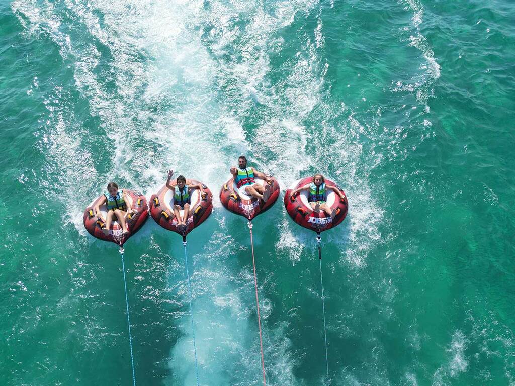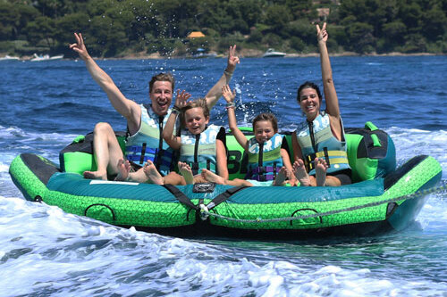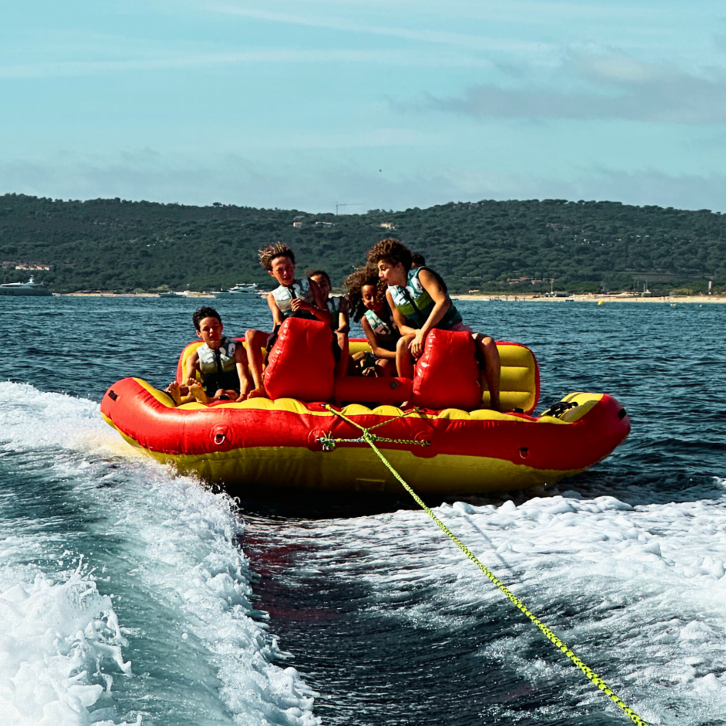 Envie de fun et d’adrénaline sur l’eau ? Découvrez les bouées tractées à Pampelonne, l’activité nautique incontournable pour partager un moment de pur délire en famille ou entre amis ! Accrochez-vous bien pendant que notre bateau vous fait glisser à toute vitesse sur les eaux turquoise de la baie.